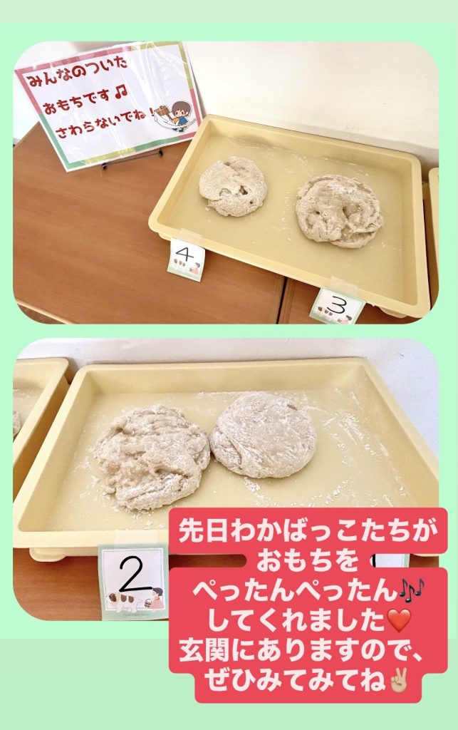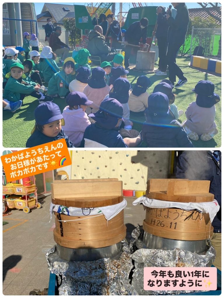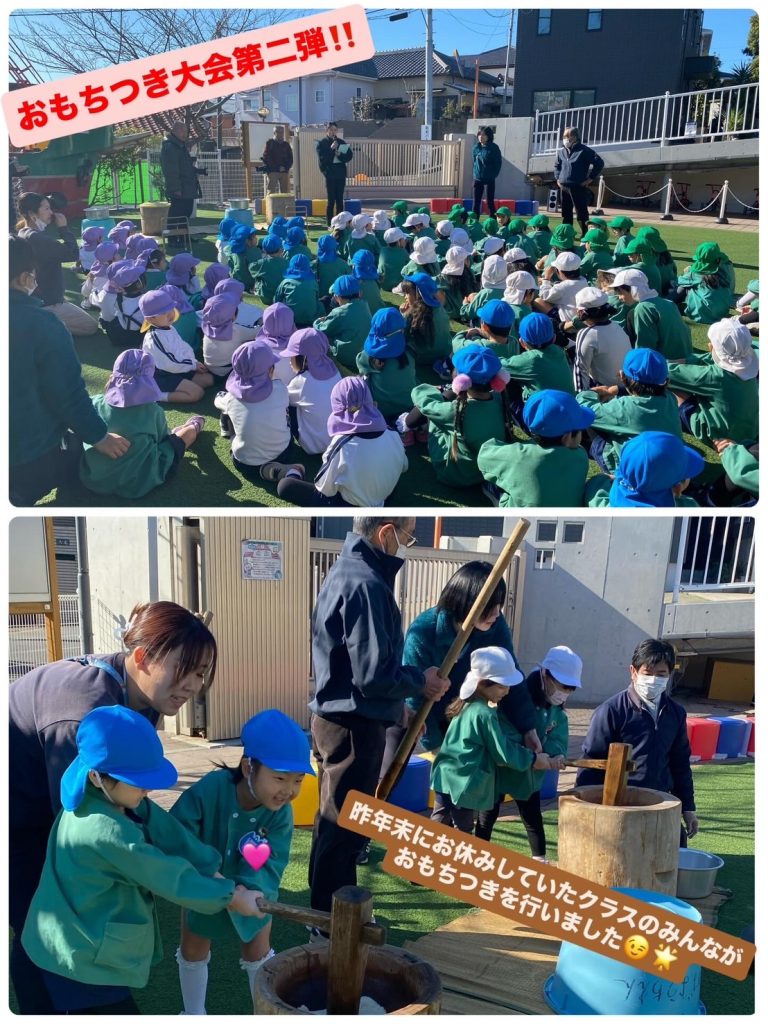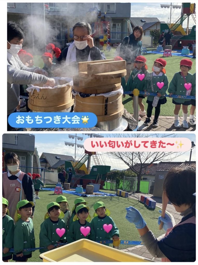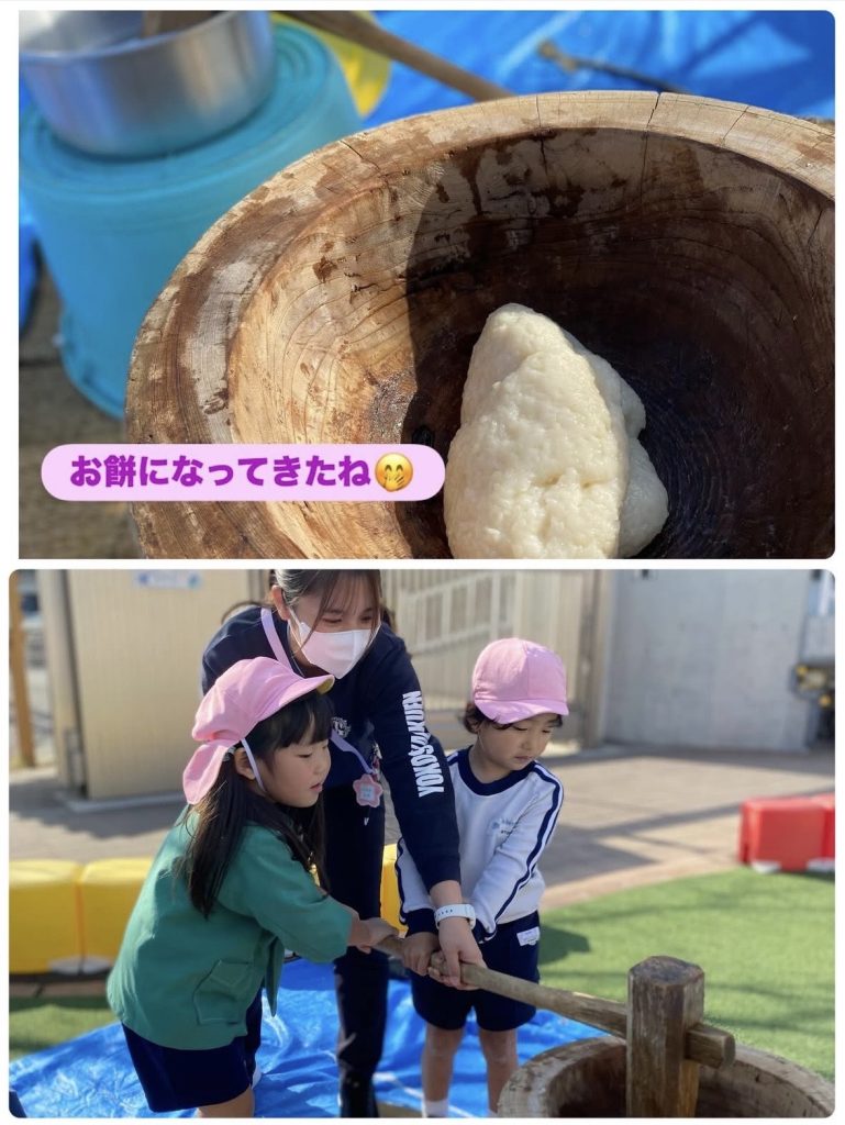 ようちえんで炊いたもち米・・・とってもいい匂いがしました🎵みんなで力を合わせてぺったん!ぺったん!元気な掛け声が響き渡っていましたよ🥰 お休み中だったクラスのお友だちは、後日にまた開催予定✨