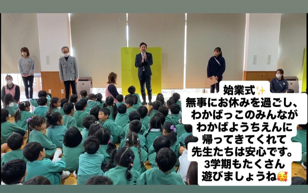 こんにちは、わかばようちえんです☀️ わかばようちえんは本日から3学期がスタート▶ 登園してくるわかばっこたちの「おはよう!」「あけましておめでとう!」「先生あいたかったよ!」「いっしょにあそぼう!」の元気な声が園内に響いて、賑やかな楽しい毎日が始まるお知らせのようでワクワクしてしまいます🤭 園長先生はお休み前お友達に 🌸事故に遭わないように気をつけて過ごしましょう 🌸怪我をしないように身体を守り ましょう 🌸あかるく・たのしく・げんきよく過ごしましょうとお話をしてくださりました。 みなさんも無事にお過ごしでしたか?今年もたくさんのお友だちとわかばようちえんの広い園庭であそべることを楽しみにしております!