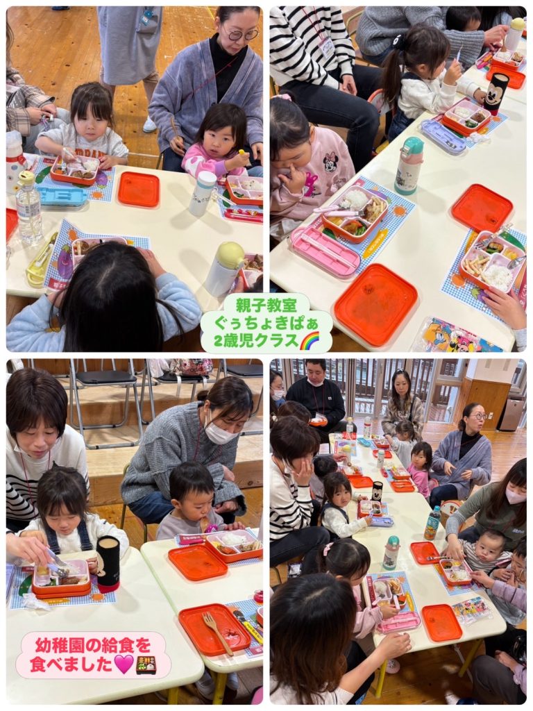 先日、親子教室ぐぅちょきぱぁ2歳児クラスのみんなで幼稚園の給食を食べました🎶