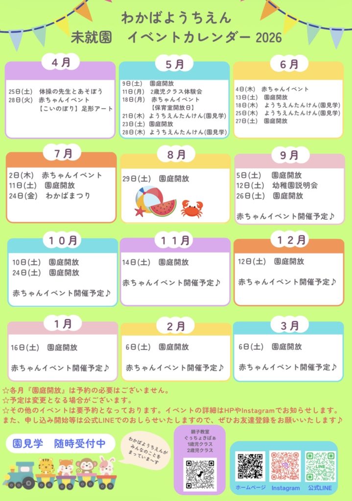 各イベントの申し込み方法は、上の【☆大事なお知らせ☆】に記載してますのでぜひタップしてみてください🎵 わかばようちえんがみんなのことをまっているよ〜💓