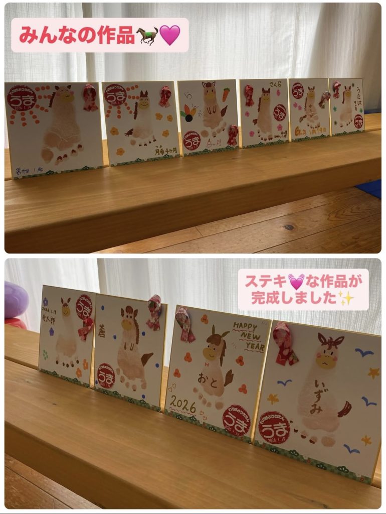 ちいさな足形にパパママおばあちゃんたちが上手に描き描き…いろんな表情のお馬さんが完成しました❣️