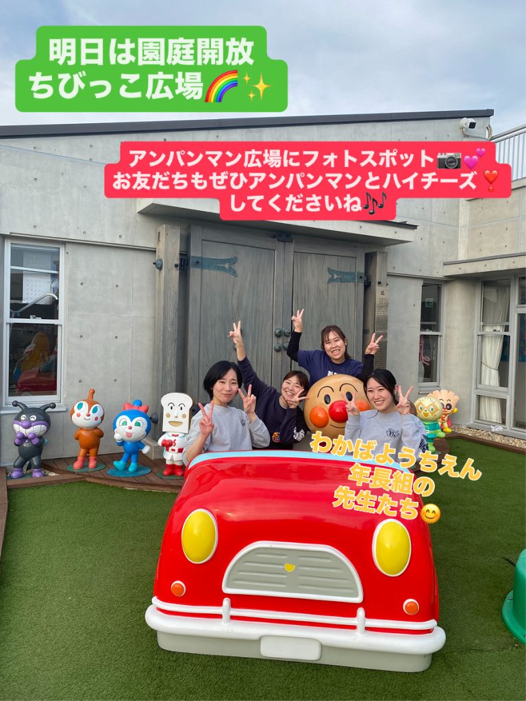 こんにちは、わかばようちえんです😉明日12/13 (土)は園庭開放【ちびっこ広場】です!明日は寒くなりそう💦あそびにくる小さいお友だちが風邪をひかないように・・・今回はホールを開放いたします✨お部屋を温かくして、おもちゃをたくさんご用意して待っていますよ😊広いホールで身体をたくさん動かしておもいっきり遊びましょう🎵もちろん、ゆったりあそぶのも👍 かわいいフォトスポットもご用意してます😊おともだちと一緒になかよしピース✌️たくさん写真を撮ってくださいね! 寒さに負けない💥元気なおともだちは園庭、アンパンマン広場も開放しておりますのであそんでもオッケイ🎵ぜひご近所の方やおともだちもお誘いして、あそびにきてくださいね!わかばようちえんがみんなのことをまっているよ~💕